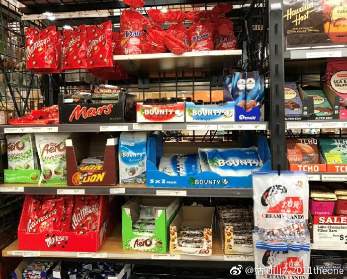 (注:配有照片,零食架上挂有奶糖,中文“大白兔”。)