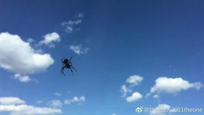 (注:配有照片,蓝天白云下悬空一只蜘蛛。)