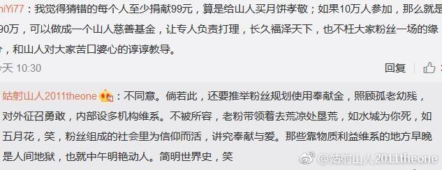 ZhiYi77:我觉得猜错的每个人至少捐献99元,算是给山人买月饼孝敬;如果10万人参加,那么就是990万,可以做成一个山人慈善基金,让专人负责打理,长久福泽天下,也不枉大家粉丝一场的缘分,和山人对大家苦口婆心的谆谆教导。