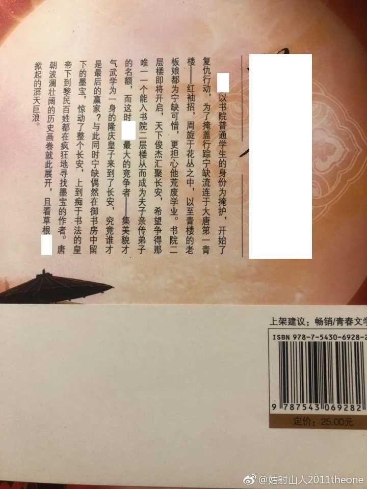 (注:配有照片,《将夜之朱雀之火》封底打码图。)