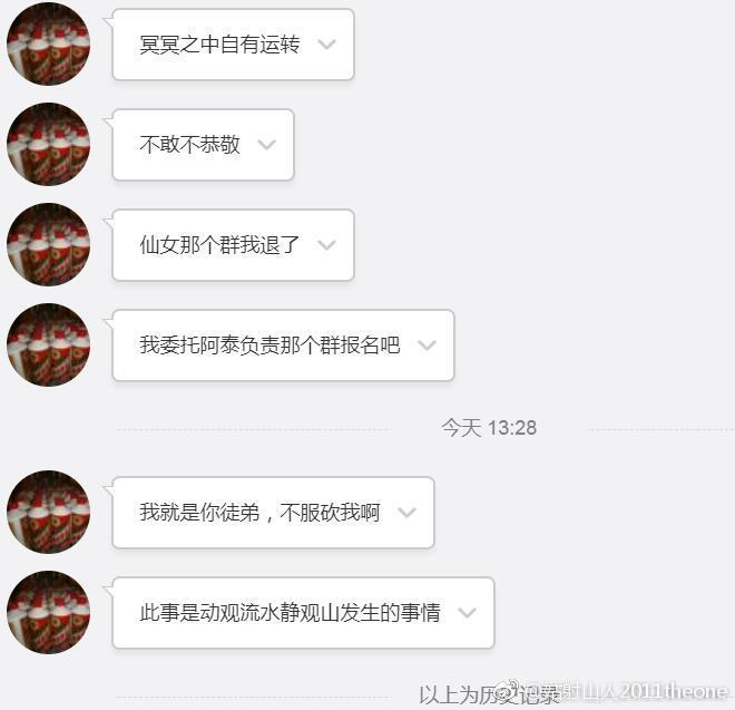 (注:配有图片,微博私信。“我就是你徒弟,不服砍我啊”。)