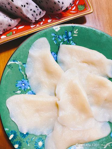(注:配有照片,红盘子里火龙果、绿盘子里饺子。)