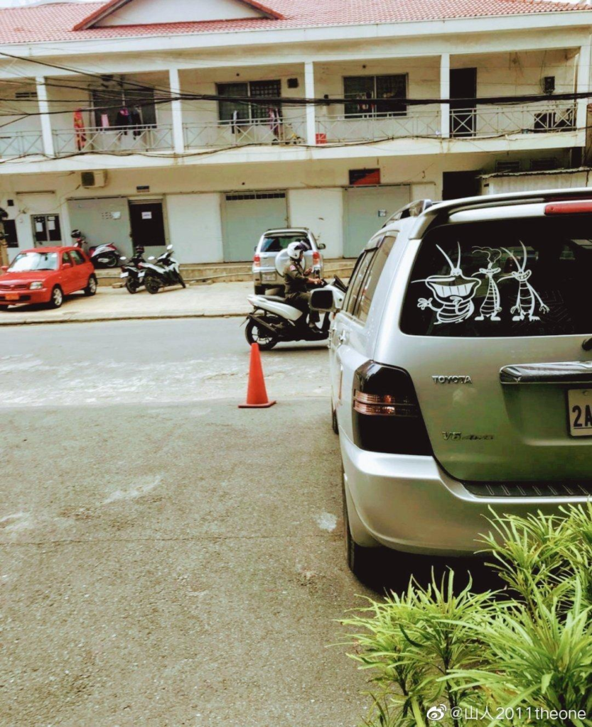 (注:配有照片,丰田车后窗显示法国动画片人物《肥猫大战三小强》。)