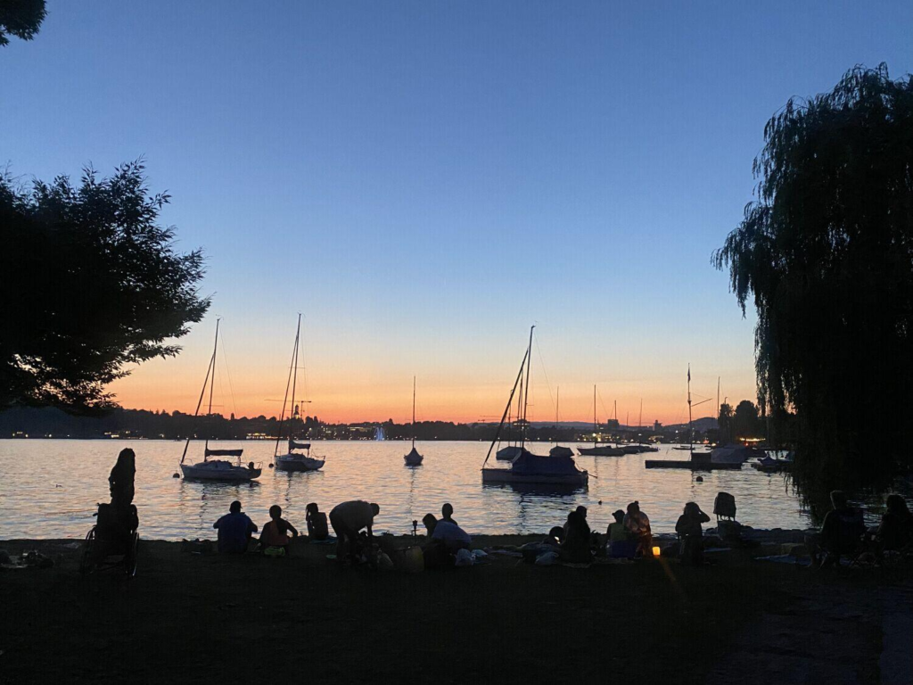 (注:配有照片,晚霞中湖面、船影、人影。)