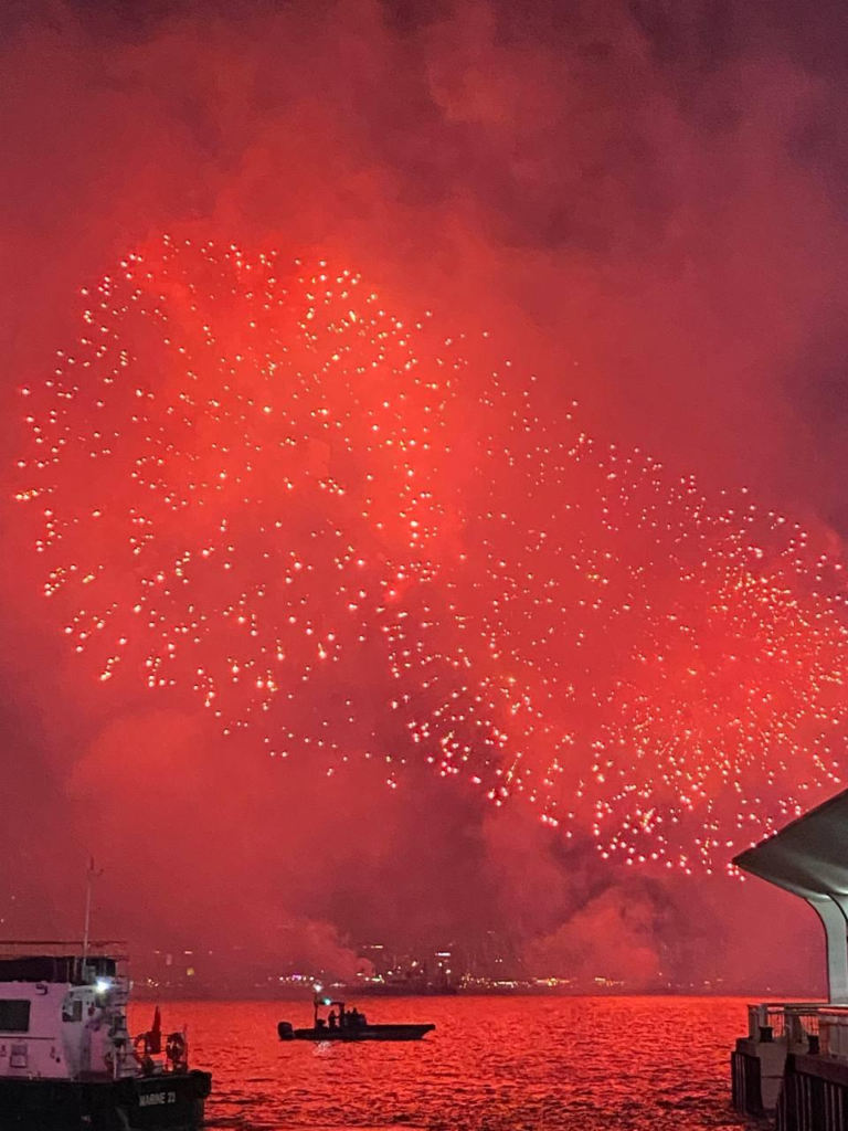 (注:配有照片,夜空红色烟花。)