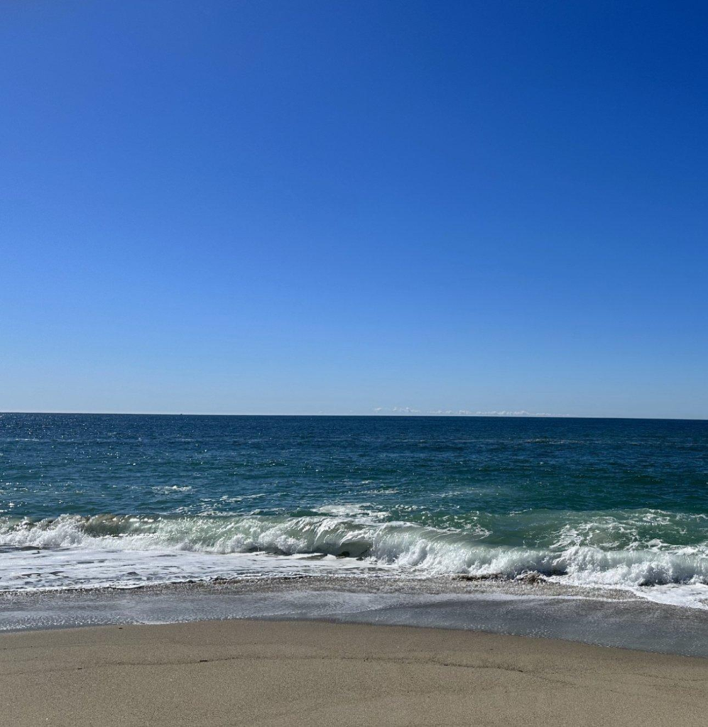 (注:配有照片,沙滩上蓝色海天一线。)