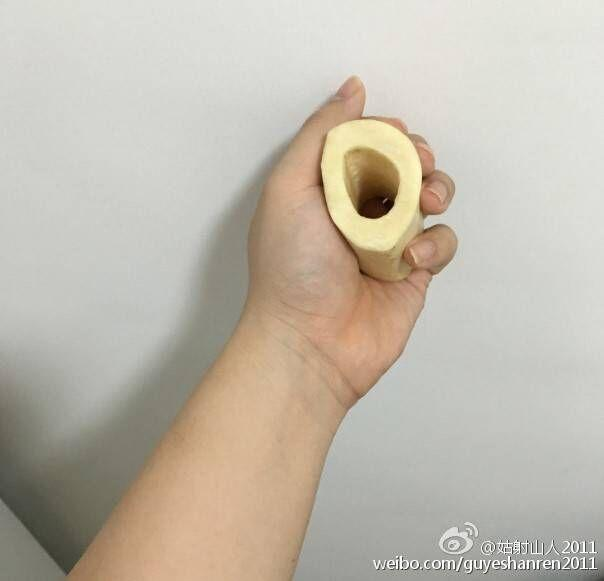 (注:配有照片,白色背景,手中握有一节淡黄色空心牛骨。)